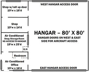 The Hangar Bay measures 80' x 80'. The hangar door openings are 19' tall and 67' wide.